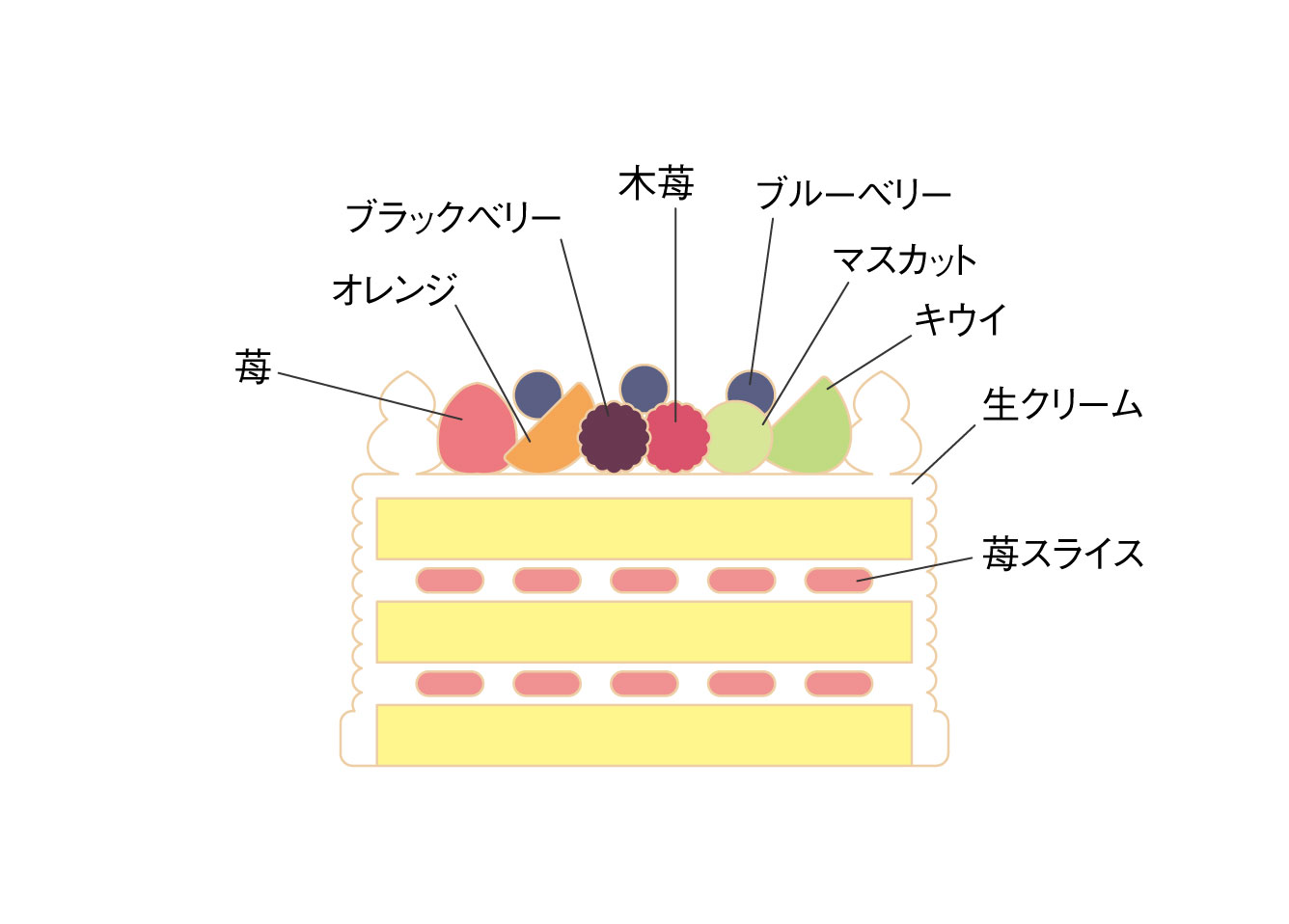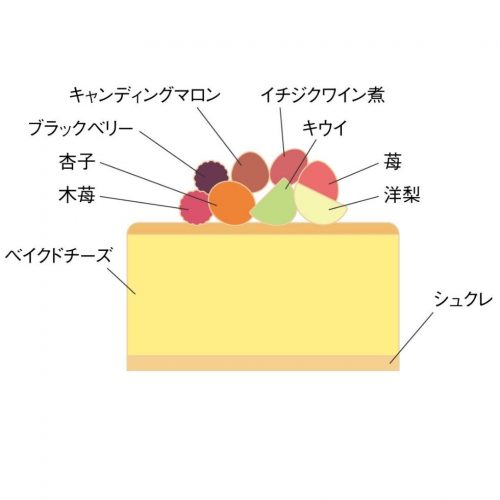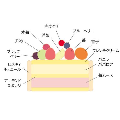 ムースの上には、フレンチクリームとたっぷりのフルーツを乗せ、華やかに仕上げました。
