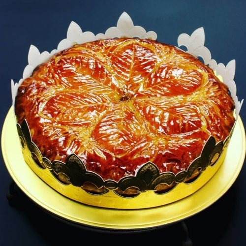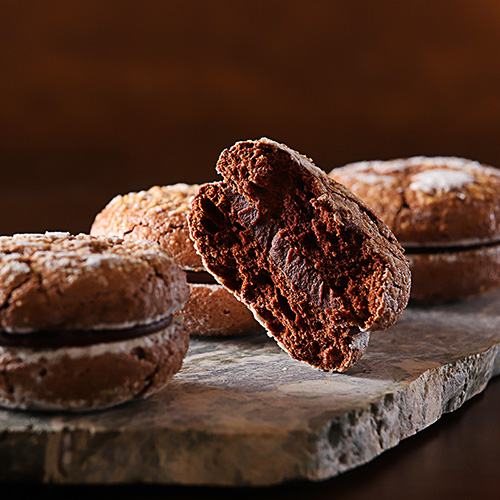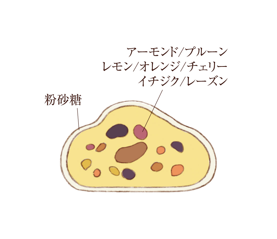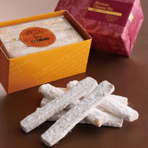 サクッとした食感のパイ生地とサブレ生地を交互にサンドし、エダムチーズを入れて焼き上げ、粉糖をまぶして仕上げました。