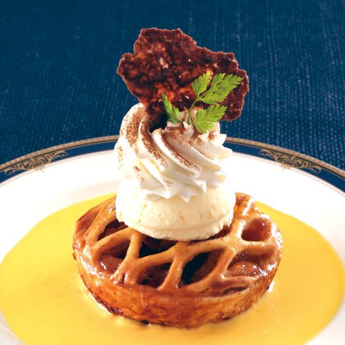 渋皮栗の刻みが入ったバニラのババロアを、生クリームと蒸し栗ペーストで仕上げたアントルメ。