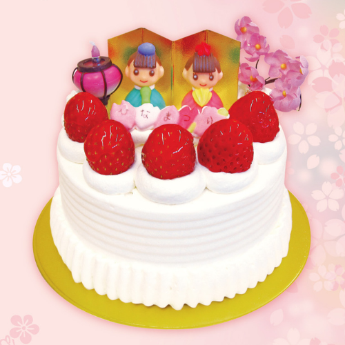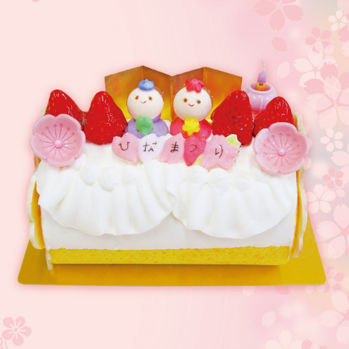 フレッシュ生クリームで苺をサンドしたガトーフレーズに、ひな人形・桃の花を飾りました。