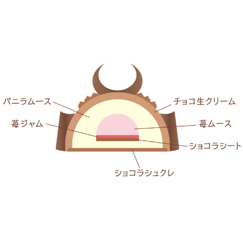 お子様の健やかな成長や幸せを祈ってお祝いするこどもの日にあわせてカブトの形で仕上げました。バニラムース、苺ムース、チョコクリームの組み合わせです。